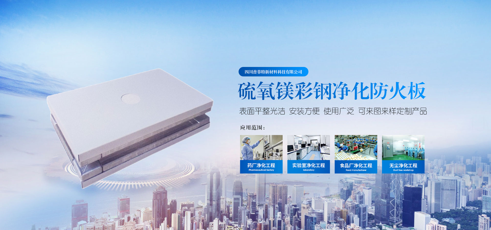 四川普菲特新材料科技有限公司,根據(jù)潔凈室彩鋼板防火要求,研制生產(chǎn)的硫氧鎂彩鋼防火板。它是以綠色環(huán)保建材為主體, 經(jīng)特殊的生產(chǎn)工藝,科學(xué)的安裝接點而成的,新穎潔凈室墻體材料。